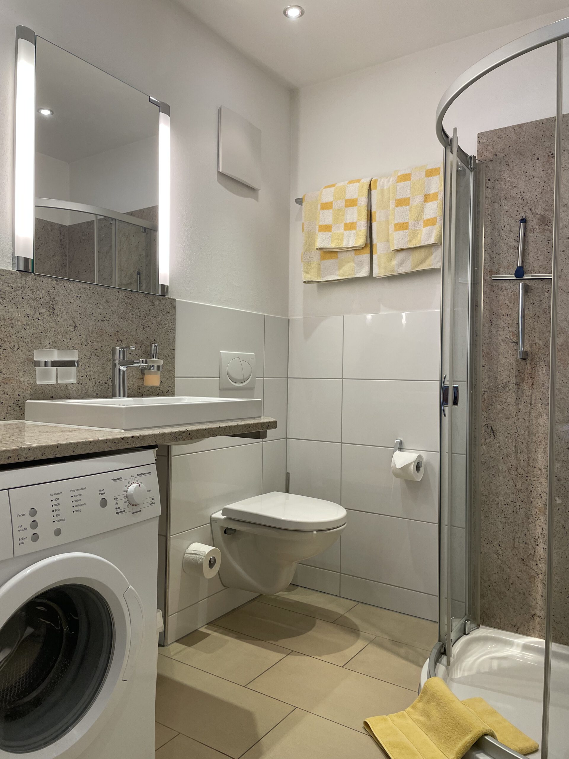 Das kleine aber feine Badezimmer mit Dusche und WC ist praktisch und modern ausgestattet. Die integrierte Waschmaschine sorgt dafür, dass auch bei längeren Aufenthalten alles frisch bleibt.